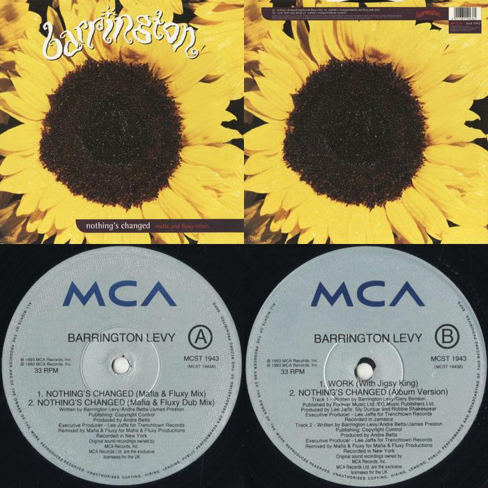 ベテラン・ダンスホール・ディージェイ Barrington Levy が大手 MCA より世界へ発信された 93年作 " Barrington " から、アシッド・ジャズ・テイストの洒落た " Nothin's Changed " のシングル・カット。ブリストル・ダブな感触に仕上げた Mafia & Fluxy Dub Mix とダブ・ヴァージョンに加えて、Jigsy King とのマッシブなダンスホール・チューン " Work " をカップリング !! *ジャケット EX *ジャケットの拡大画像はコチラから。 |